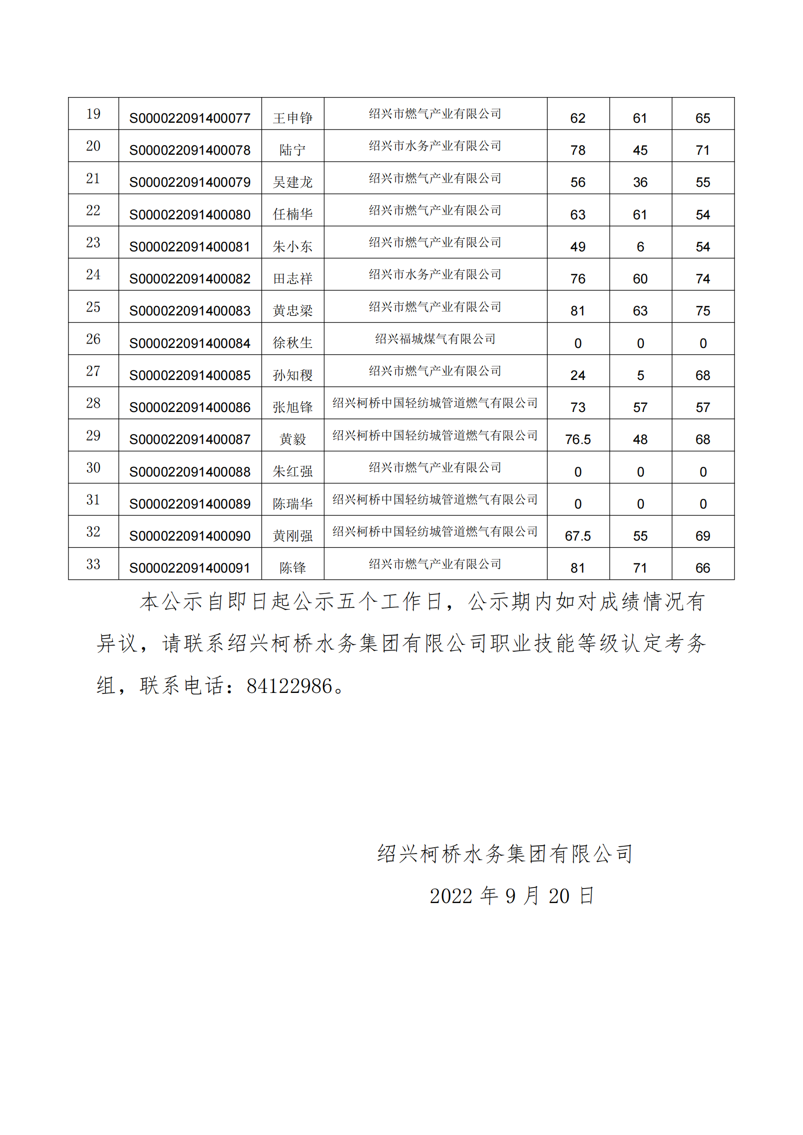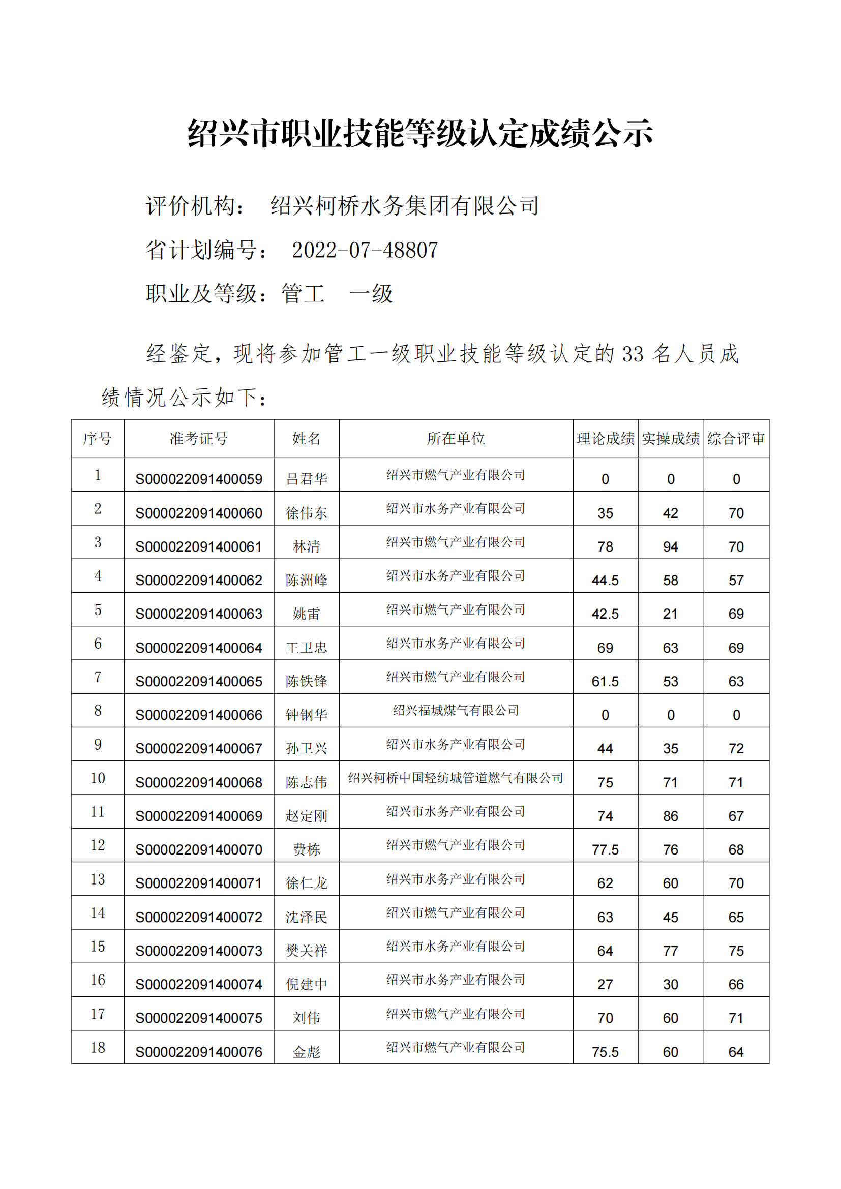 绍兴市职业技能等级认定成绩公示(管工一级)