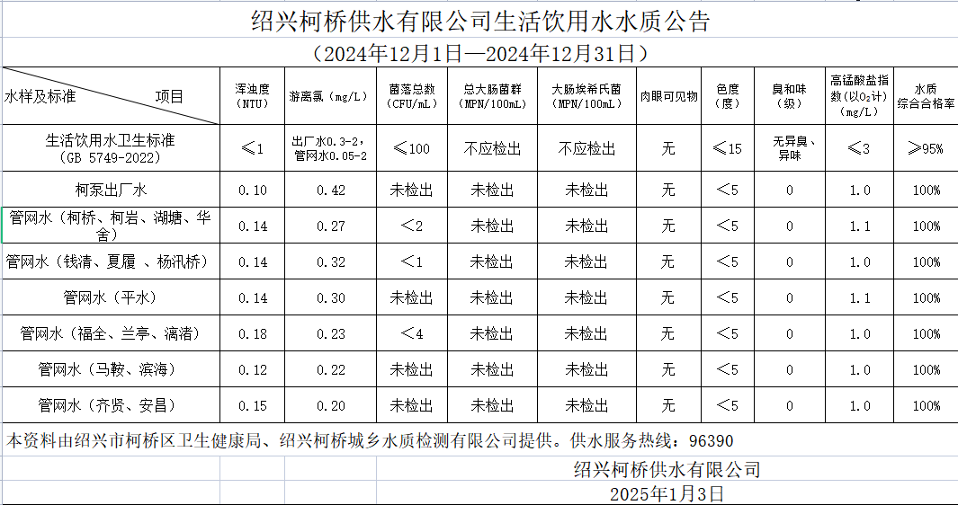 米兰注册水质公告(2024年12月1日—2024年12月31日)