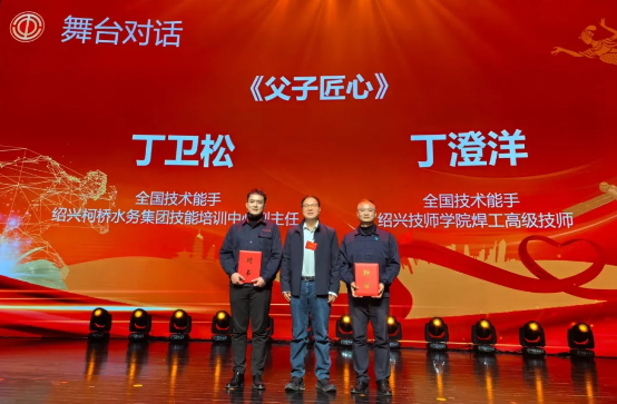 其中,全国技术能手、浙江省劳动模范、柯桥水务集团技能培训中心常务副主任丁卫松,以及同为全国技术能手的儿子丁澄洋同台,通过一出舞台对话——《父子匠心》,讲述父子两代“接力”续写劳模工匠的励志故事,生动的故事和真挚的情感引发了现场观众的深深共鸣。