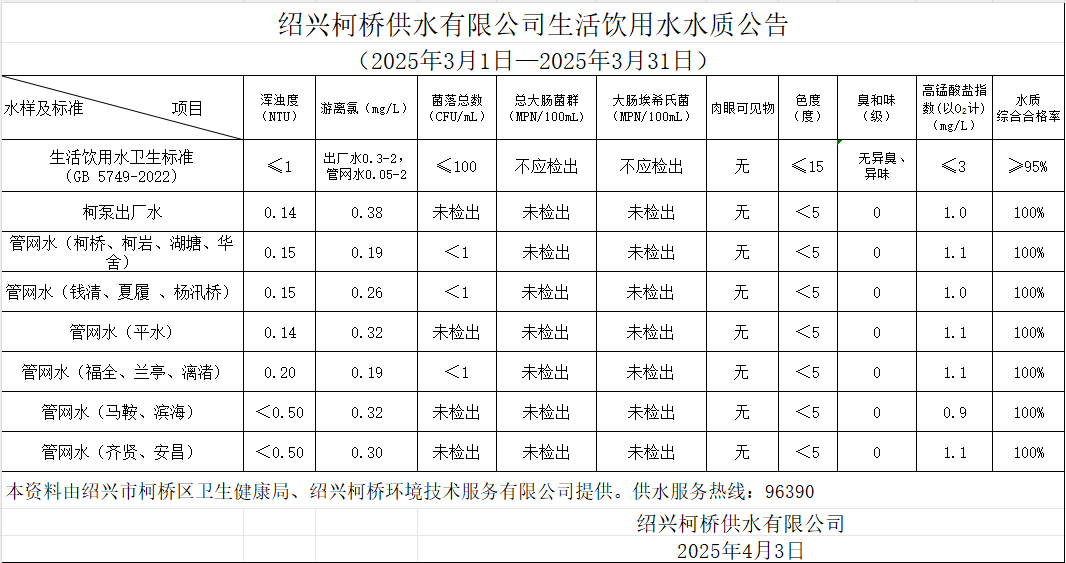 米兰注册水质公告(2025年3月1日—2025年3月31日)