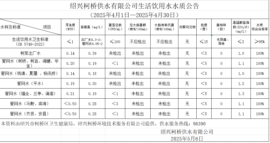 米兰注册水质公告(2025年4月1日—2025年4月30日)