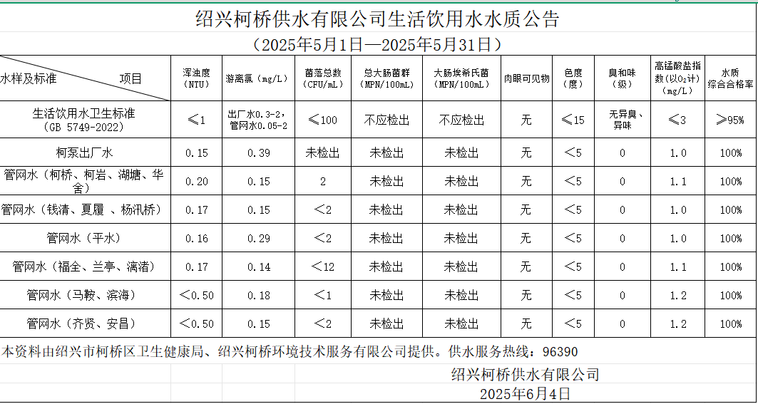 米兰注册水质公告(2025年5月1日—2025年5月31日)