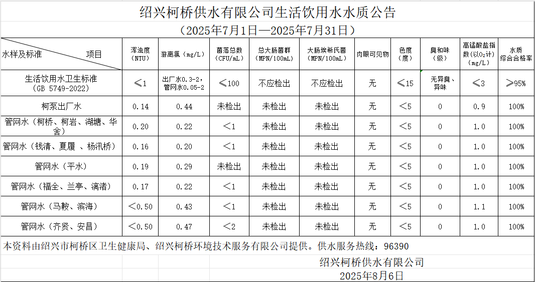 米兰注册水质公告(2025年7月1日—2025年7月31日)