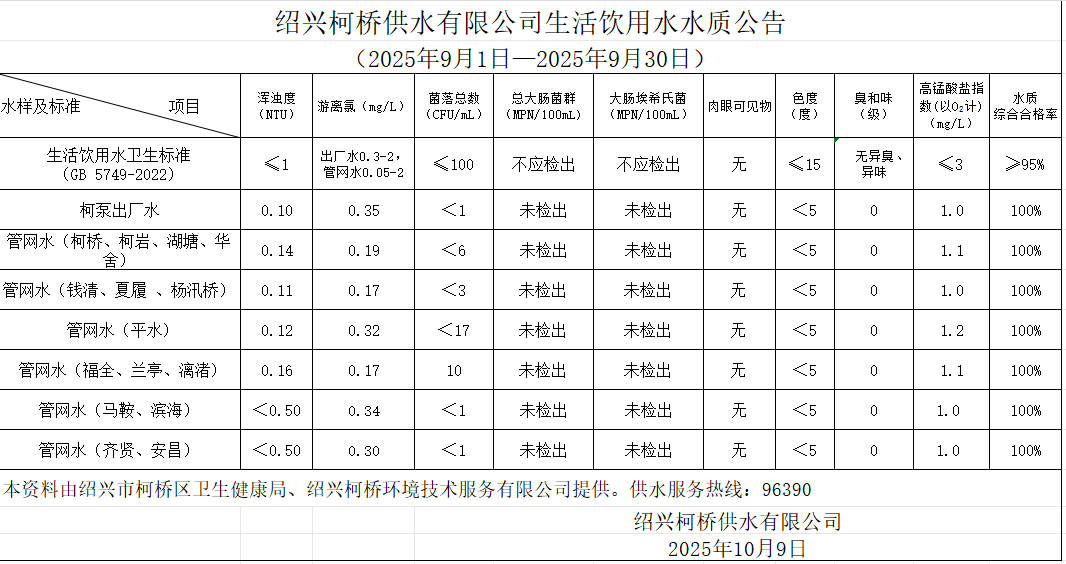 米兰注册水质公告(2025年9月1日—2025年9月30日)