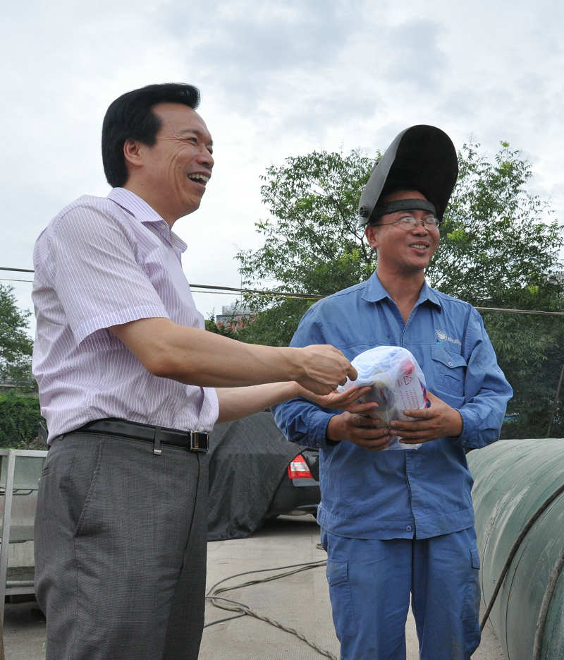 7月12日上午,县委副书记、县长孙云耀,县委副书记孟柏干等县领导冒着高温到独山DN1000自应力管改造现场慰问供水公司一线职工,向供水管道安装人员表示慰问,并送上防暑慰问品,叮嘱大家继续坚守岗位,科学安排工作,合理调整作业时间,切实做好防暑降温工作。集团公司董事长倪阿泉等有关领导陪同慰问。