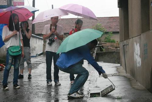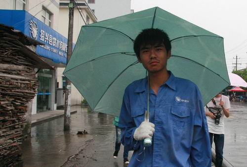 来到一个弄堂口,小吴说,你们不用跟我进来,里面只有一只表,等会还要原来返回。不一会,他回来了。因为弄堂又长又窄,小吴只好撑下伞钻出来。