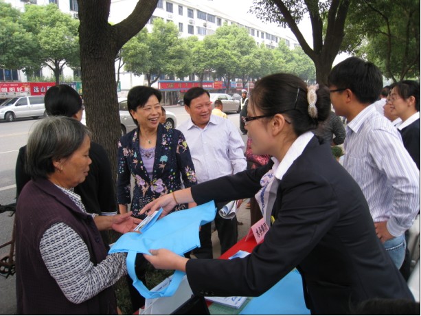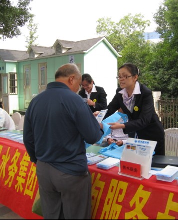 在城区中心地段鉴湖路设摊解答过往行人的咨询、投诉,听取意见建议,广泛进行供排水法规等知识的宣传。