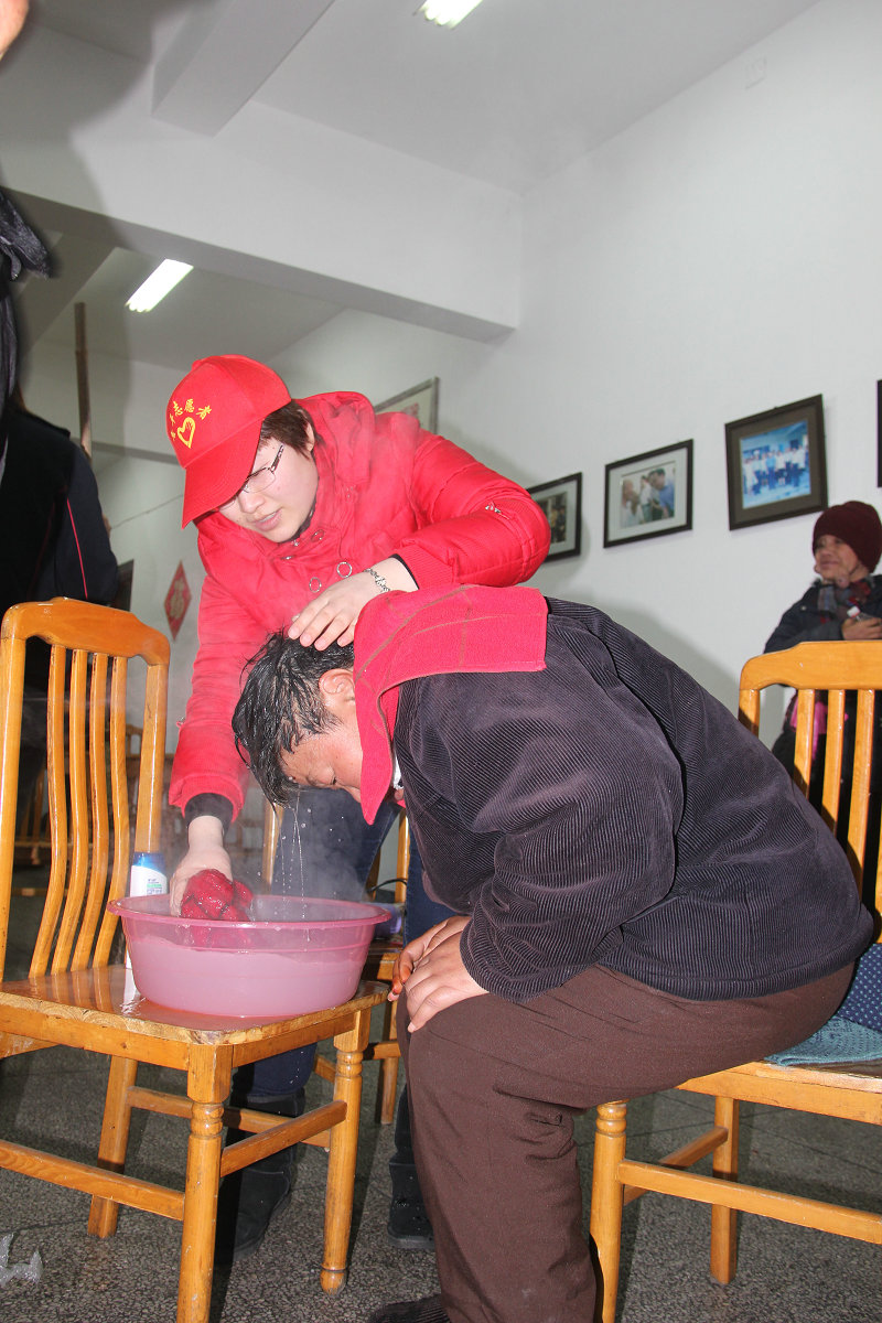 图为集团志愿者正在为柯桥夕阳红中心老人洗头