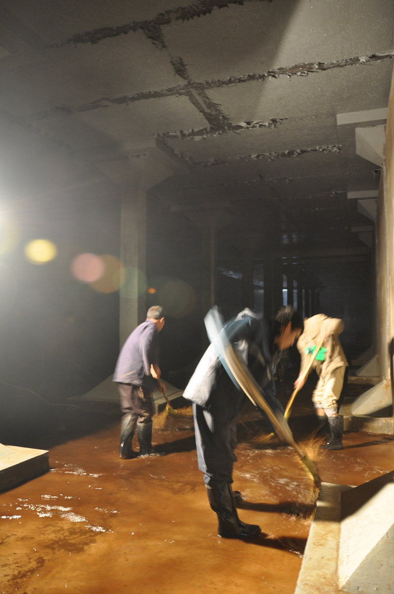 图为供水公司员工正在清洗清水池