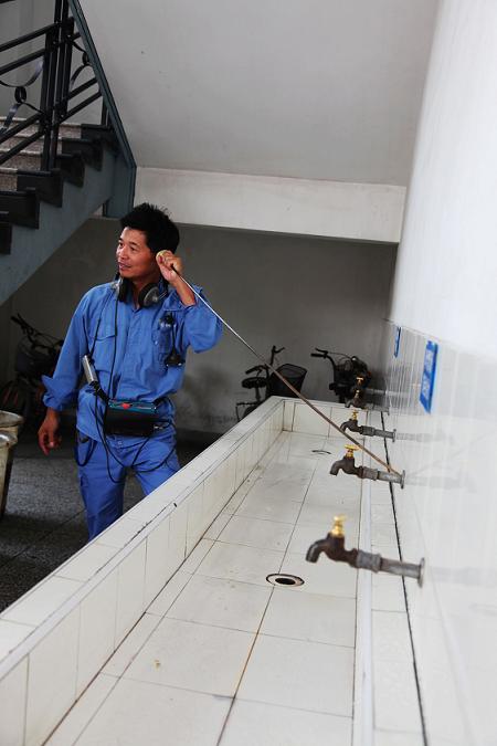 图为供水公司水质化验员对学校内管网水进行现场检测化验