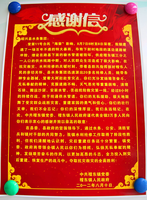 8月17日,中共稽东镇党委、稽东镇人民政府专程为集团送来感谢信和锦旗,衷心感谢集团在第11号台风“海葵”期间,发扬艰苦奋斗、无私奉献精神,第一时间成功抢修被毁坏的输水总管,保障了该镇人民群众的饮水安全。
