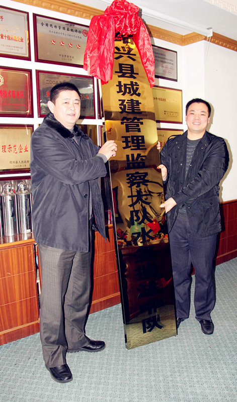 ,绍兴县城建管理监察大队水务执法中队成立授牌仪式在排水公司举行。县城管办副主任许立人、集团公司副总经理冯梁峰等领导参加仪式。