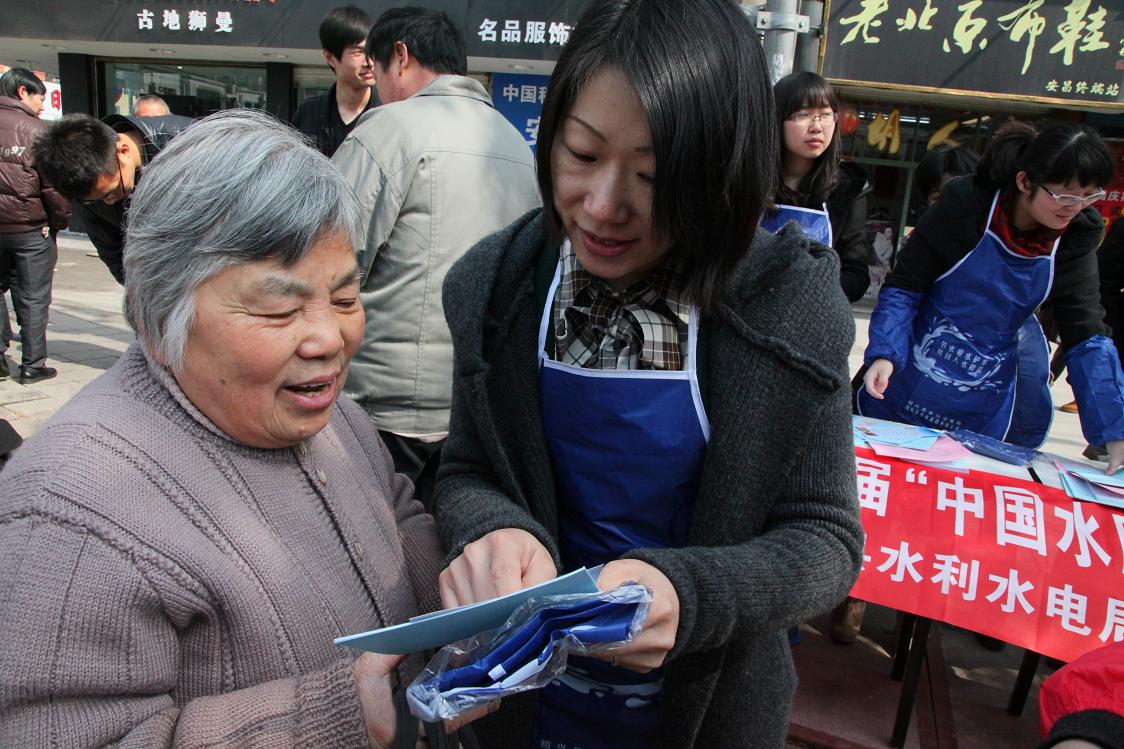 图为工作人员向过往的居民宣传节水、护水知识