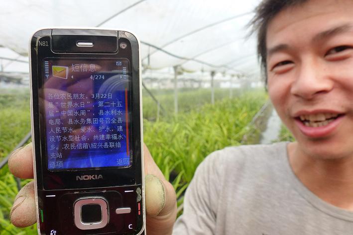 图为农民朋友正在查看通过“农民信箱”发送过来的节水知识短信