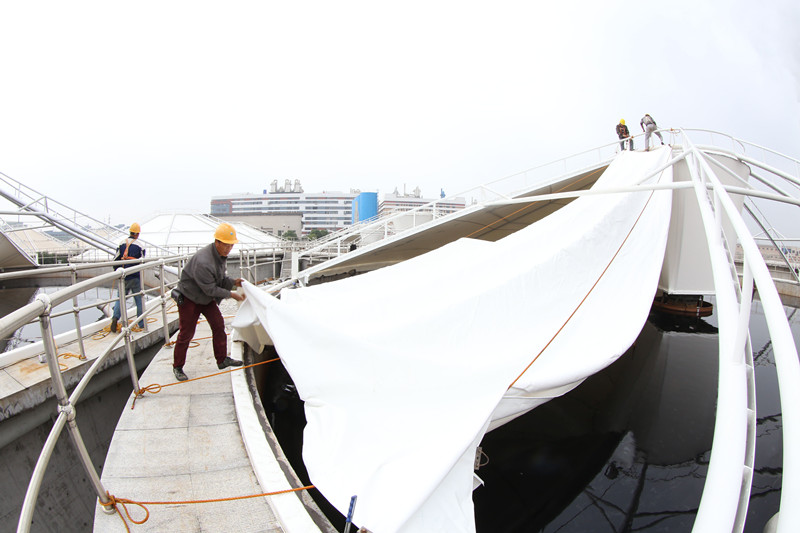 日前,江滨水处理公司20万吨/日集中预处理二期工程污泥浓缩池进入钢结构膜安装阶段,预计于本月底基本完成。该除臭系统由8个钢结构反吊膜装置及2个生物除臭装置组成,为公司第四批建设的除臭项目。至此,公司在臭气治理上已累计投入2000余万元,目前厂区内高、中浓度臭气基本实现全收集、全治理,为实现“生态江滨”目标打下了坚实基础。