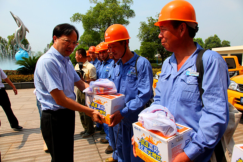 7月12日上午,县委书记何加顺、副县长周树森等领导在水务集团董事长倪阿泉、总经理单宝子等领导陪同下来到公司慰问在高温下作业的供水一线职工,亲手把防暑降温慰问品送到他们手上,并再三叮嘱有关人员落实好夏季高温时段的防暑降温措施,确保一线职工身体健康。