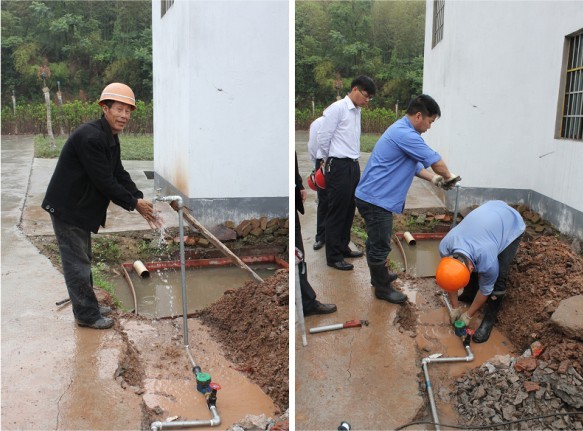 为尽快帮助村民解决用水问题,安装小组冒雨前往。在安装现场,我们看到有人在使用套丝机,有人在接水管,大伙忙的不亦乐乎。经过2个小时的奋战,顺利为其接通水源,安好水表,并装好了水龙头。当现场看到水龙头流出水的那瞬间,大家的心情都非常激动,费某的脸上更露出了久违的笑容,欣喜的用手接起了新家的“第一股清泉”。