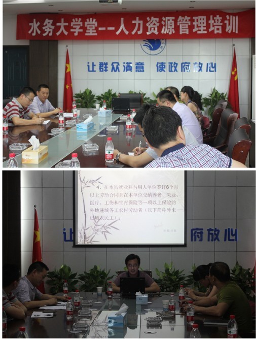 7月19日,县水务集团第七期水务大学堂在滨海水司办公楼三楼会议室顺利举行,县人力资源与社会保障管理局贺东权主任和吕芳科长应邀授课。集团系统各个办公室主任、分管副主任及人事管理干部共13人参加了培训。