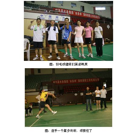 为宣扬企业文化,提倡“快乐工作、健康工作”,增进青年职工的团队协作意识,增进同事之间的默契度,拉近跨部门业务的操作距离,2010年5月22日,水务集团团委在绍兴市城东体育馆举办了第四届“水务杯”羽毛球比赛。